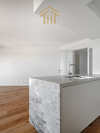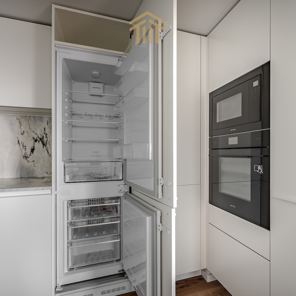 A cozinha em conceito aberto, em pedra de alto padrão, graciosamente integrada à sala, é um sonho para qualquer entusiasta culinário. Totalmente equipada com eletrodomésticos modernos da prestigiada marca Smeg, oferece funcionalidade impecável e espaço de sobra para dar asas à sua criatividade gastronómica.