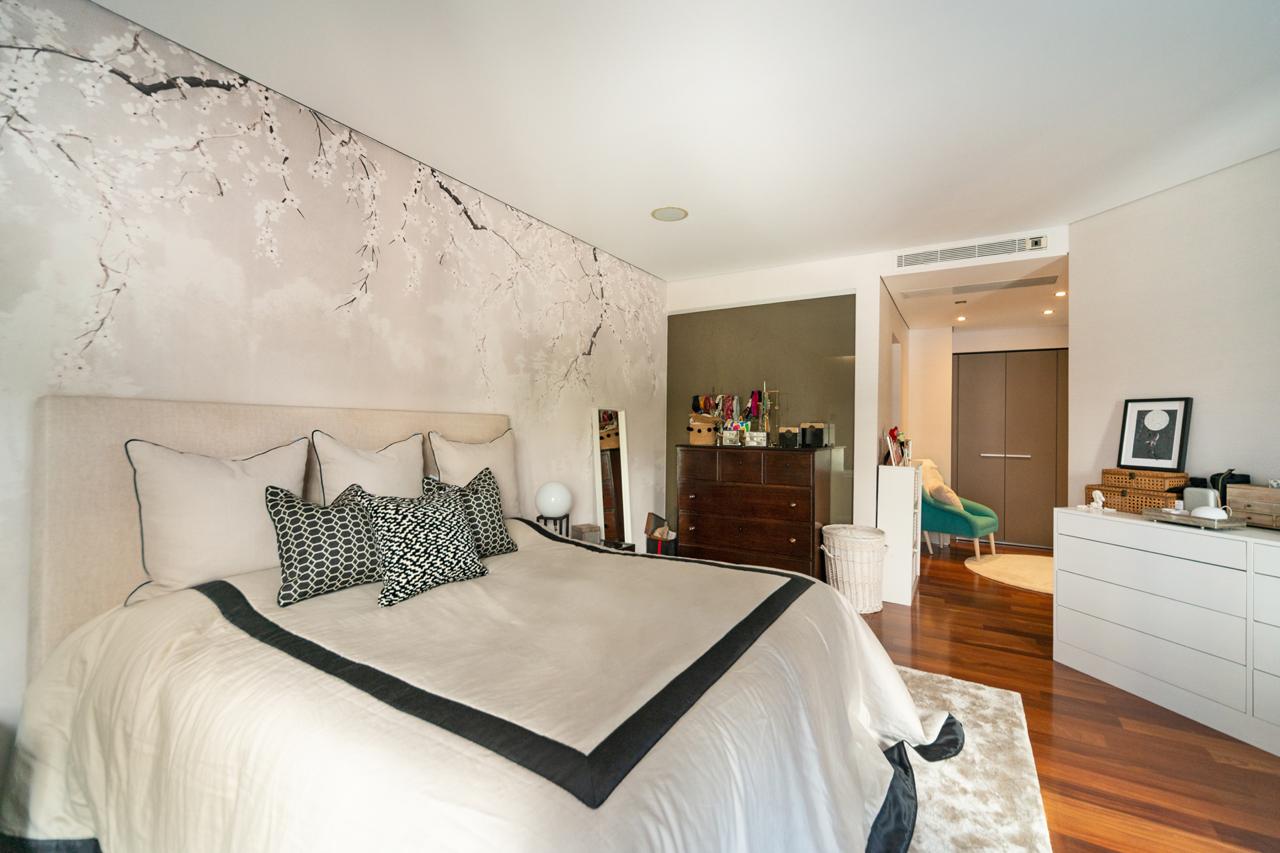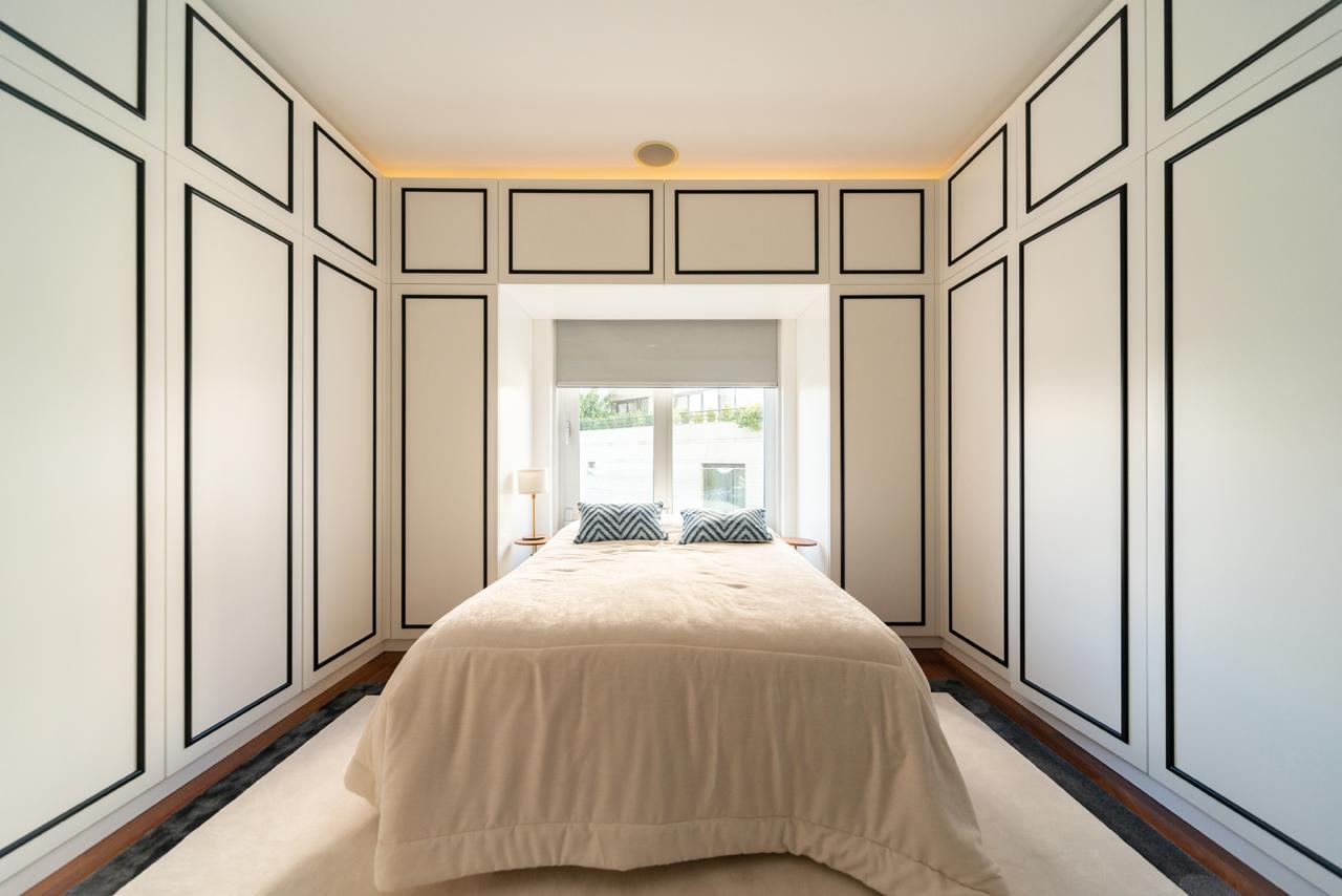 O imóvel conta com 5 suítes, todas equipadas com ar-condicionado, sistema de som integrado e casas de banho de luxo. Destacam-se 2 suítes com walk-in-closet e 2 suítes com roupeiro embutido, ambas com acesso à varanda. Há também um roupeiro embutido de apoio no hall das suítes.